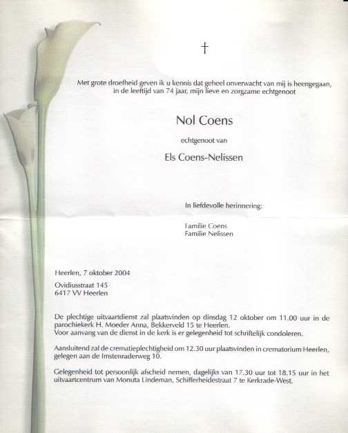 Op donderdag 7 oktober 2004 is ons clublid Nol Coens bij een verkeersongeluk vlakbij zijn woning om het leven gekomen. Nadere informatie volgt.